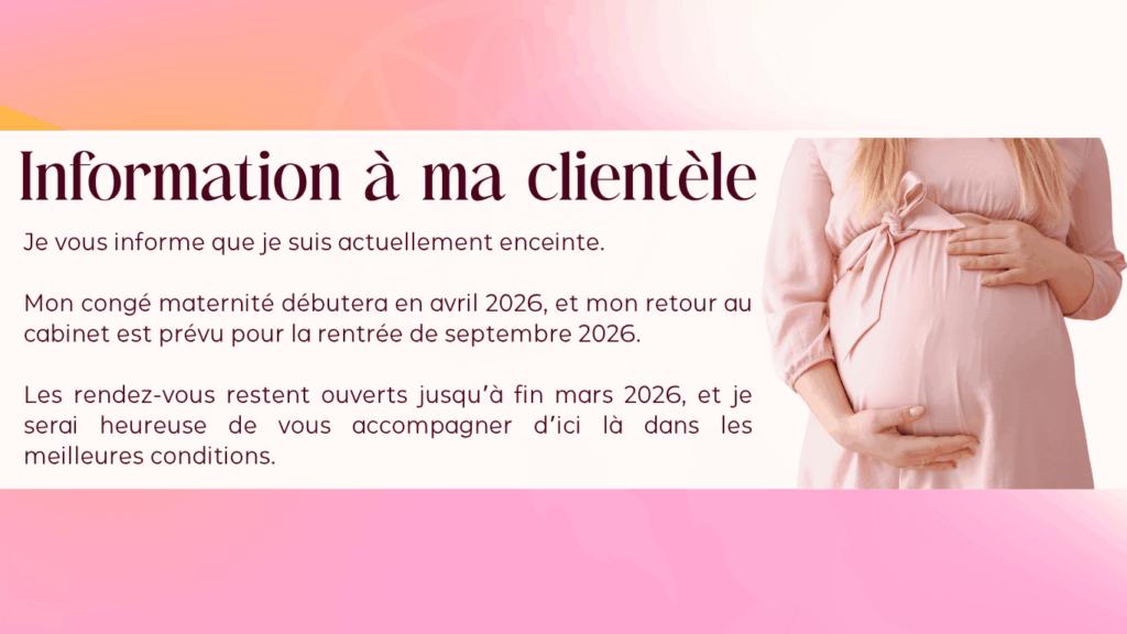 Attention: Merci de vous présenter à l’heure exacte de votre rendez-vous. Si vous arrivez en avance, il est possible que je sois encore en séance et que vous deviez patienter à l’extérieur, car je ne dispose pas de salle d’attente.En cas de retard de votre part, la séance débutera à l’heure prévue afin de respecter les rendez-vous suivants.